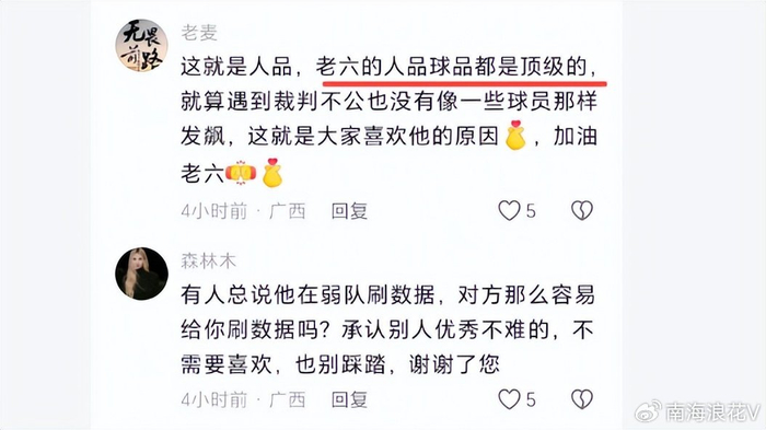 球迷也是大夸庞峥麟,“这就是人品,老六的人品球品都是顶级的,就算遇到裁判不公也没有像一些球员那样发飙,这就是大家喜欢他的原因,加油3老六。”诸位,你对江苏球星庞峥麟向杜锋鞠躬这一出人意料的一幕,有何评论?
